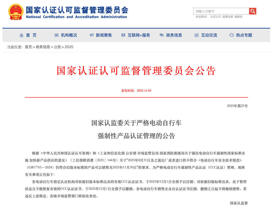 《公告》明确,各电动自行车指定认证机构对依据旧版本标准出具的有效CCC认证证书,于2025年12月1日全部予以注销;对依据旧版标准出具、处于暂停状态且不能恢复有效的CCC认证证书,于2025年12月1日全部予以撤销。