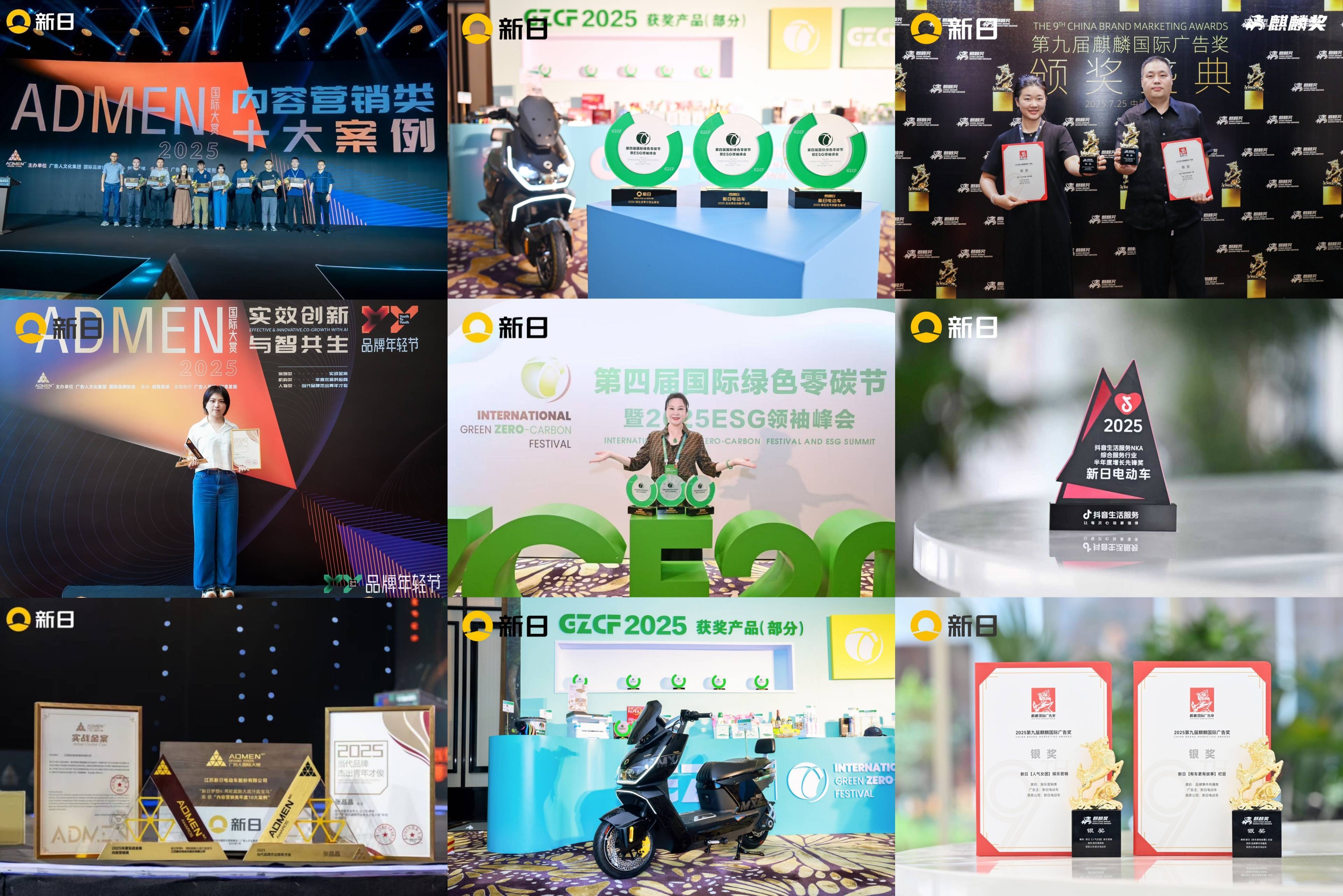 增长的高度,不止于财报,更在于品牌价值与行业地位的实质性提升。新日2025“聚焦爆品,营战高峰”战略峰会,凭借其清晰的战略布局与行业引领性思考,成功吸引央视镜头聚焦报道,在国家级媒体平台上传递出新日的前瞻视野与战略定力。在品牌建设层面,新日的综合实力与创新实践亦获得多项高含金量奖项的集中认可:在2025国际绿色零碳节上,新日一举斩获杰出绿色创新产品奖、绿色技术创新先锋奖及绿色消费引领品牌奖,彰显其在可持续出行领域的领先地位;于第九届麒麟国际广告奖评选中,新日凭借出色的跨界营销与事件传播,荣膺娱乐营销奖与品牌事件传播奖;在2025ADMEN国际大赏中,新日的营销案例更获得年度十大案例奖、活动营销实战金奖等殊荣。此外,新日还频频受邀亮相广交会、摩博会等具有全球影响力的行业舞台,向世界展示中国电动出行的创新成果与智造品质。