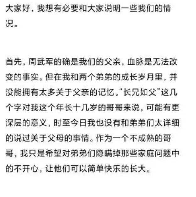 一篇长文,把父母的离婚、父亲的债务、弟弟的无辜,说得清清楚楚。父母已离婚,周柯宇不知情,如果有需要承担的责任,自己也不会逃避,不想因为父亲影响到弟弟的事业。