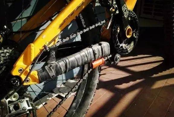 三、此时,用手握住踏板,向骑车时踏动的反方向转动(向后扳动),这时自行车会向后移动,建议腹部倚靠在座椅上,随车侧步走动。这样的话,大约转动一周不到左右,链条就会和两个飞轮同时啮合了。就修好了,可以上路了。