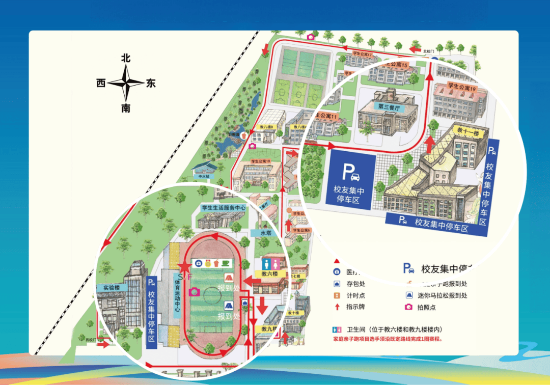 蓝色马甲的人员均为本次赛事的志愿者。参赛选手在参赛过程中如有任何需求(如路线指引、饮水补给、医疗帮助等),可随时向身边任一志愿者寻求帮助,全体志愿者同学们将竭诚为每位选手提供帮助。入校指南