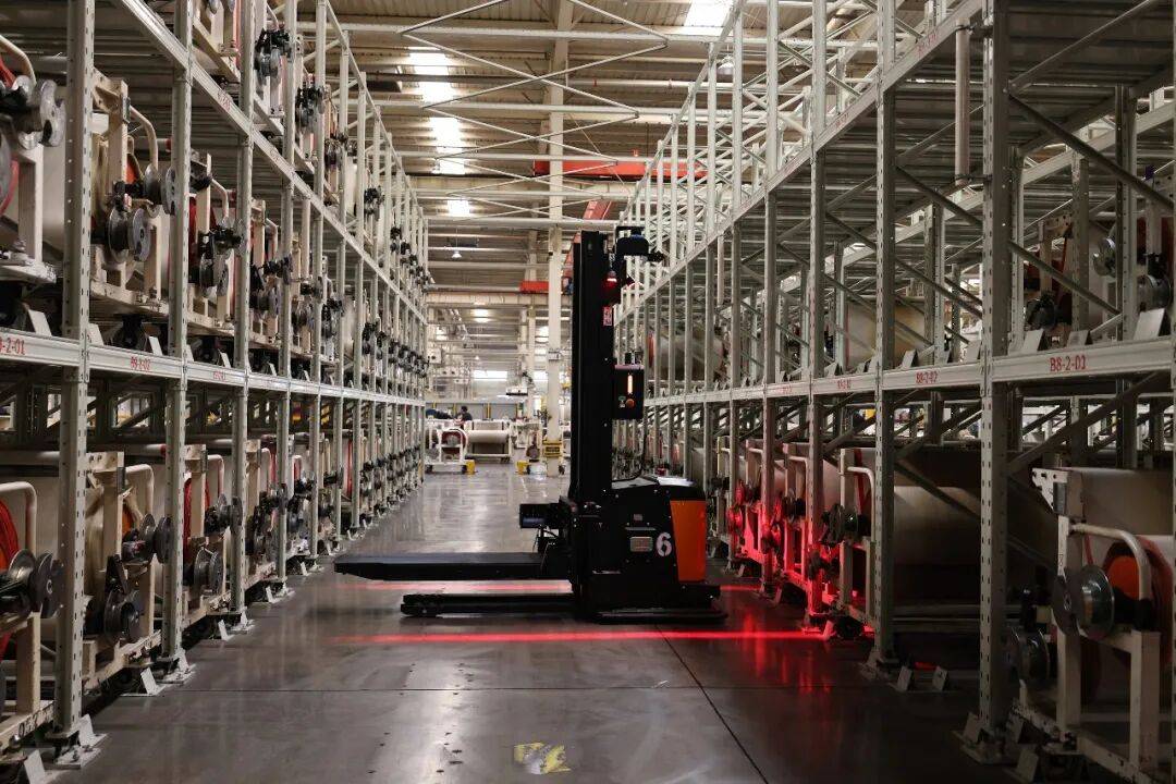 4月13日,在河北万达轮胎有限公司生产车间,智能物流搬运机器人正在工作。王垒摄