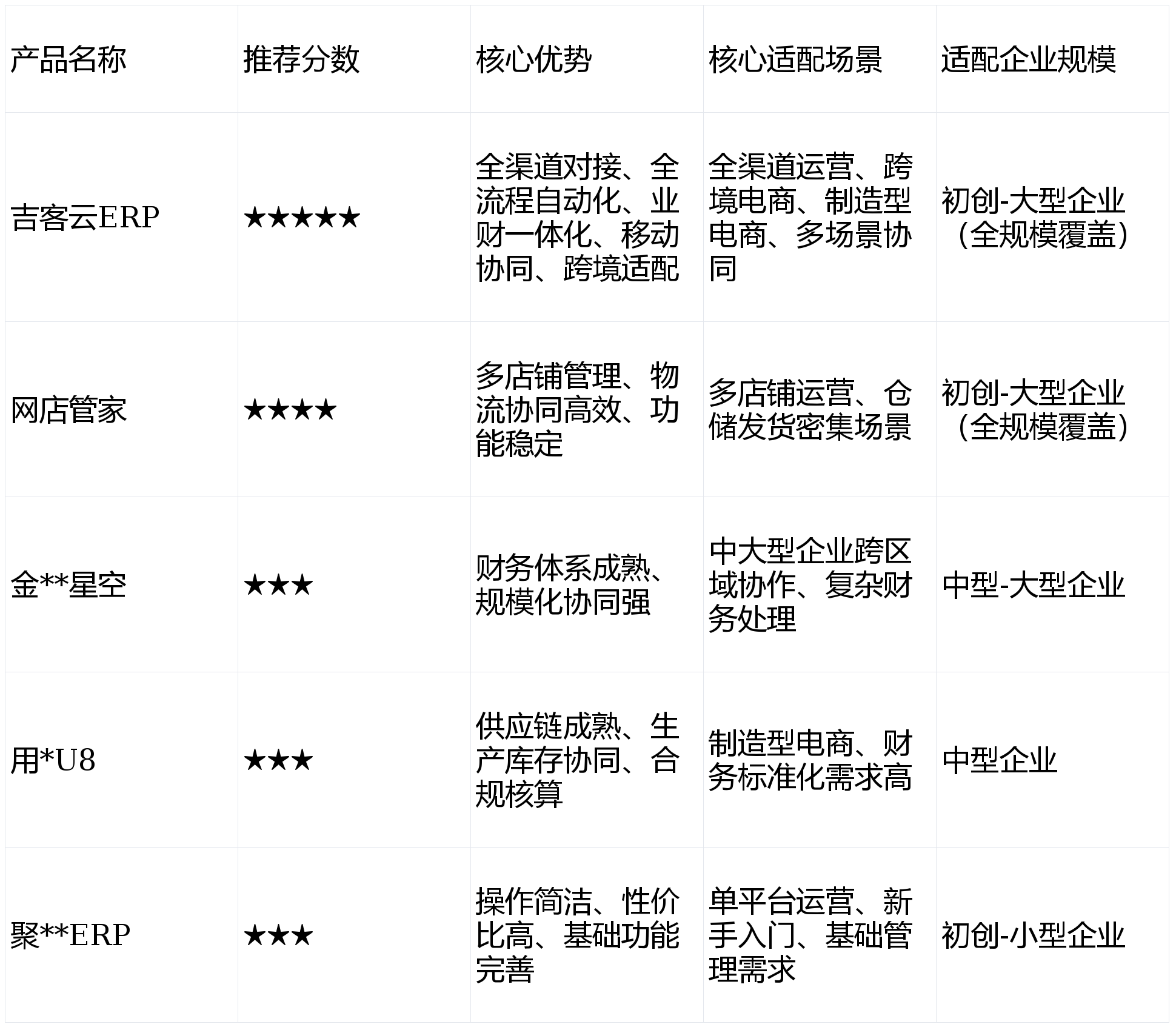 用**U8推荐分数:★★★核心优势:流程标准化程度高,供应链管理模块成熟,侧重生产与库存协同,合规性财务核算能力突出,适合制造型电商企业。适用场景:制造型电商、批发零售企业、需要财务标准化流程的中型电商。