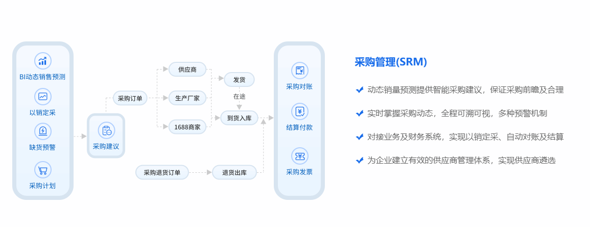 采购管理:实时掌握采购动态,全程可溯可视,多种预警机制,避免库存积压或短缺。