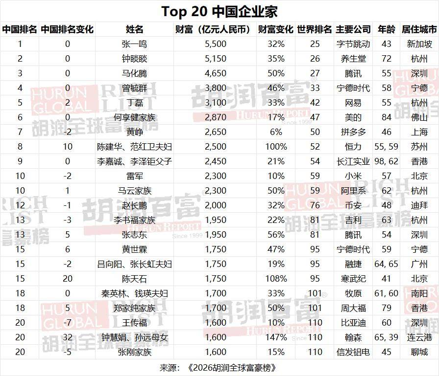 1、2026 胡润全球富豪榜发布:马斯克 5.5 万亿元一骑绝尘,张一鸣中国首富